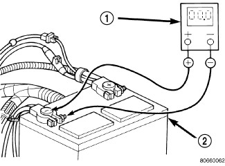 2. Connect the positive lead of the voltmeter (1) to the battery (2) positive terminal post. Connect the negative lead of the voltmeter (1) to the battery (2) positive cable terminal clamp. Rotate and hold the ignition switch in the Start position. Observe the voltmeter. If voltage is detected, correct the poor connection between the battery positive cable terminal clamp and the battery positive terminal post.