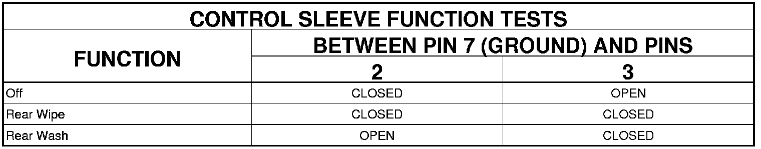 2. Using an ohmmeter, test the resistance between the terminals of the switch as shown in the three Function Tests tables. For all functions except those of the control stalk the values should be either less than 100 ohms (switch CLOSED) or greater than 1 megohm (switch OPEN).