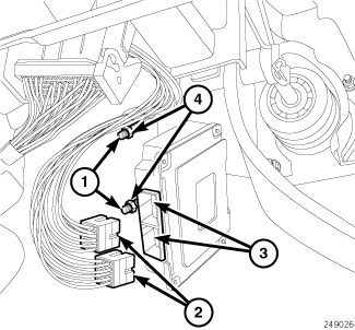 1. Install TCM mounting bracket holes (1) over the two studs on the bulkhead.