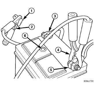 6. Allow battery in disabled vehicle to charge to at least 12.4 volts (75% charge) before attempting to start engine. If engine does not start within 15 seconds, stop cranking engine and allow starter to cool (15 min.), before cranking again.
