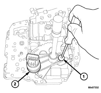 1. Install the TRS (2) to the manual shaft. Make sure TRS locating pin rests in manual valve bore slot.