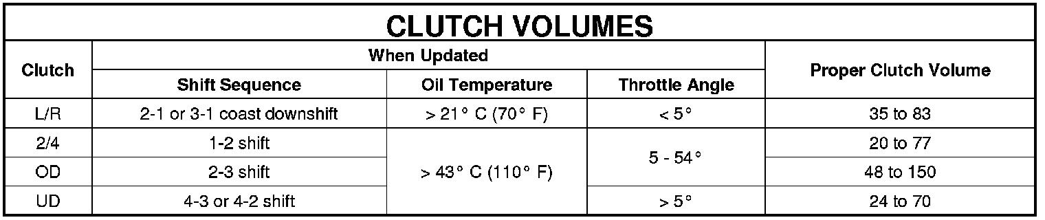 Certain mechanical problems within the input clutch assembly (broken return springs, out of position snap rings, excessive clutch pack clearance, improper assembly, etc.) can cause inadequate or out-of-range element volumes. Also, defective Input/Output Speed Sensors and wiring can cause these conditions. The following chart identifies the appropriate clutch volumes and when they are monitored/updated: