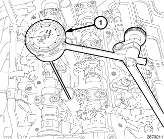 3. Mount Dial Indicator Set (1) to a stationary point on the engine. Rotate the crankshaft CW to place the number one piston at TDC on the exhaust stroke.