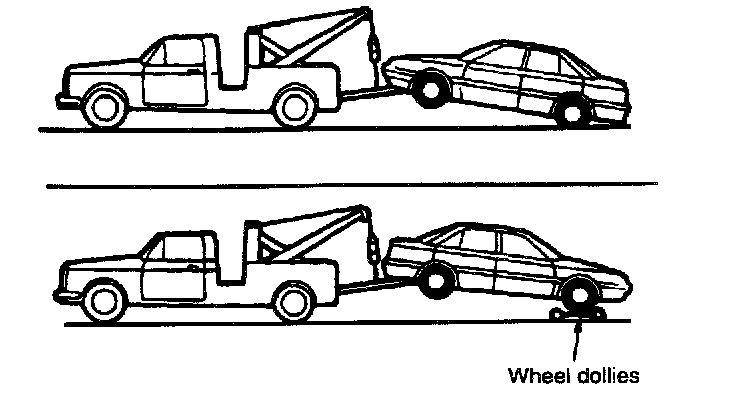 Proper towing equipment is necessary to prevent damage to the vehicle. Always observe laws and regulations applicable to vehicles in tow. As a general rule, towed vehicles should be pulled with the driving wheels off the ground. If excessive damage or other conditions prevent towing the vehicle with the driving wheels off the ground, use wheel dollies.
