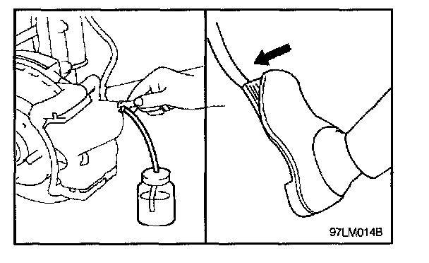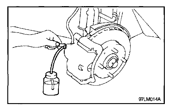 4. Depress the brake pedal a few times. Then loosen the bleeder (with the brake pedal still depressed), and tighten it after the brake fluid stops flowing.