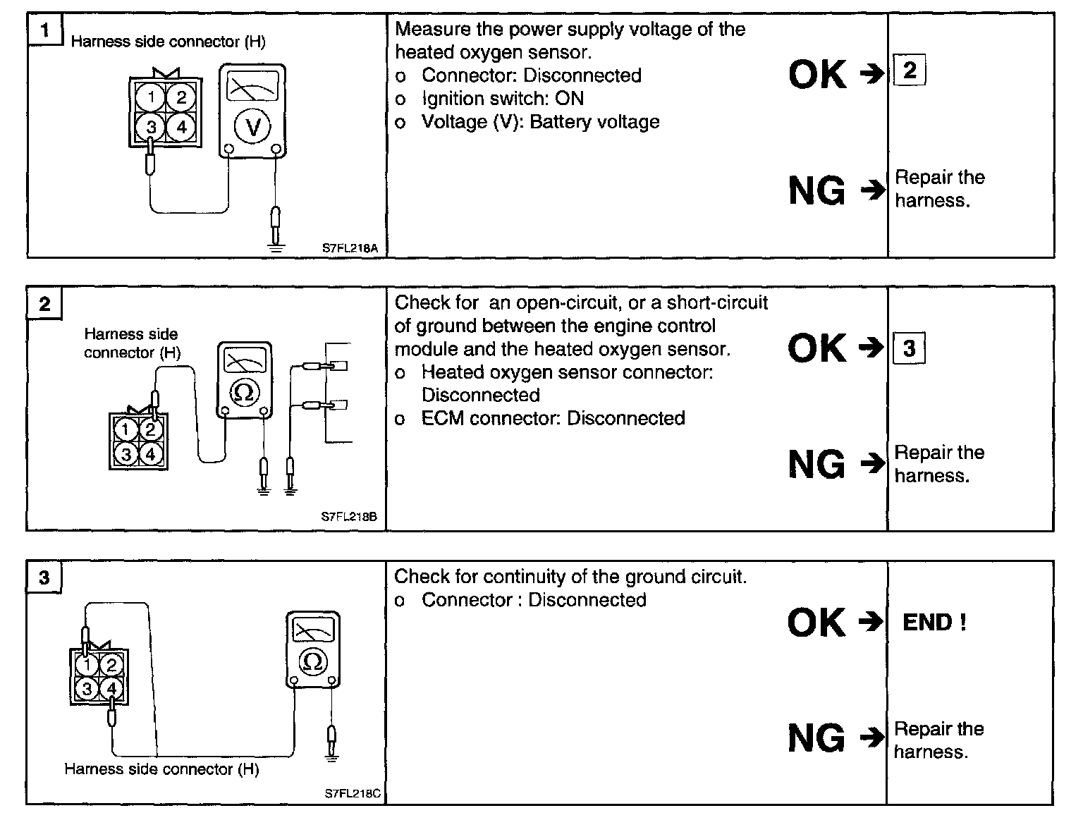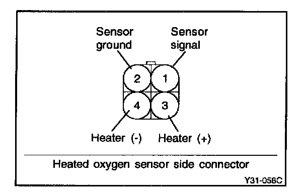 1. Disconnect the oxygen sensor connector, and measure the resistance between terminal 3 and terminal 4.
