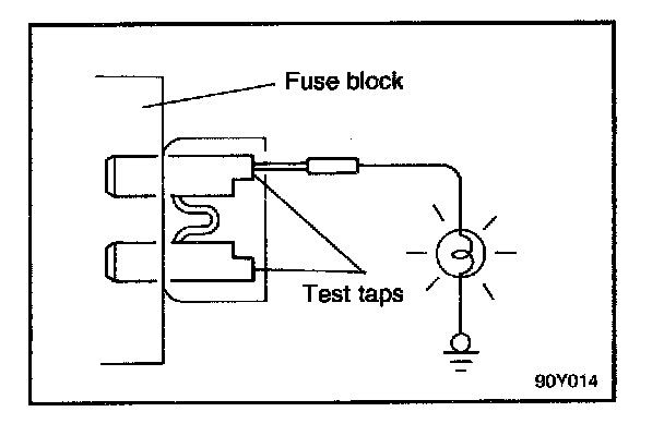 A blade type fuse has test taps provided to allow checking of the fuse itself without removing it from the fuse block. The fuse is okay if the test lamp comes on when its one lead is connected to the test taps (one at a time) and the other lead is grounded. (Change the ignition switch position adequately so that the fuse circuit becomes live.)