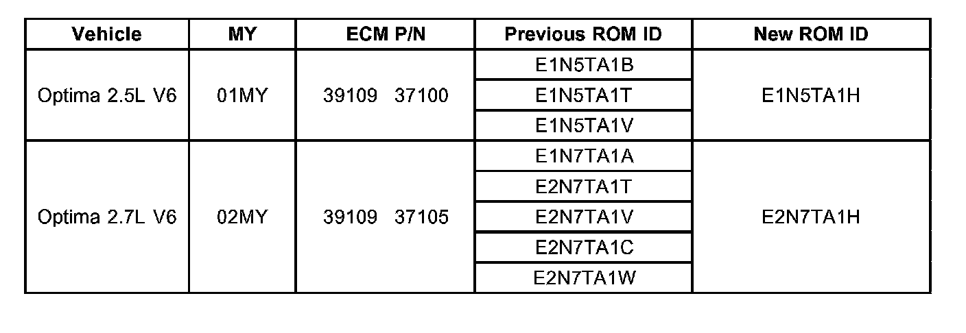 2. 2001 MY Optimas: If Campaign SC028, Optima Oxygen Sensors, published March 2003 was previously completed, then reprogram ECM following the Reprogramming Procedure for 2001 MY and 2002MY ECM in this campaign.