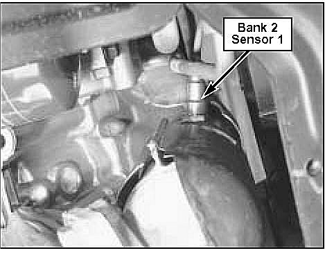 2. Open hood, disconnect bank 2 sensor 1 connector at front corner of left cylinder head and remove connector from bracket.