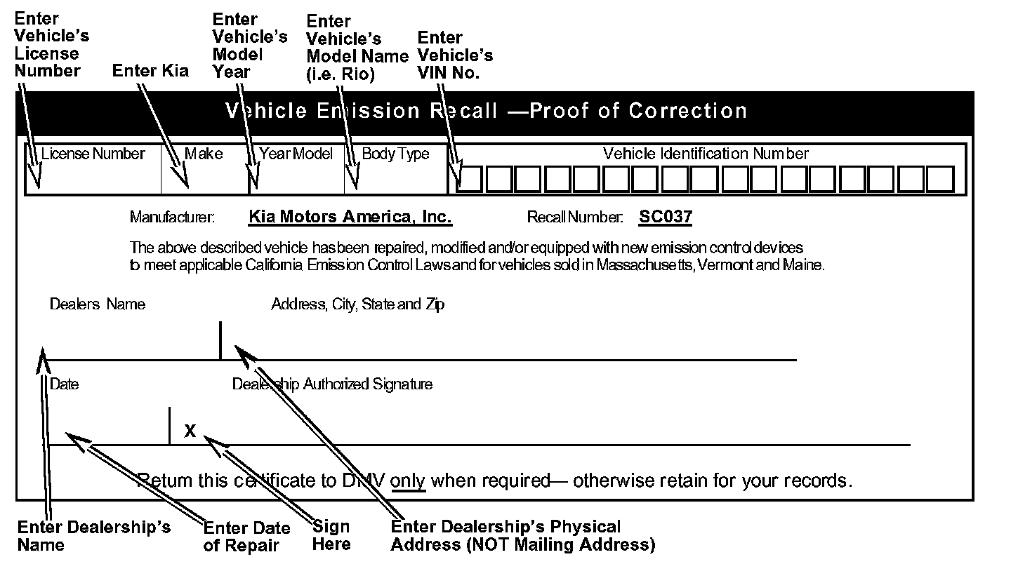 A Vehicle Emission Recall - Proof of Correction card must be filled out for all vehicles registered in California, Massachusetts, Vermont, and Maine.