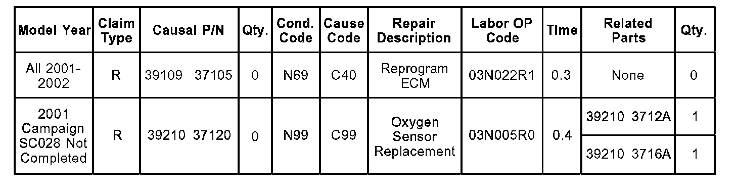 ^ For 2001 MY vehicles, check Dealer DCS System under the Warranty main menu, number 8, for open Service Campaign SC028. If campaign has been completed, reprogram ECM only. If SC028 has NOT been completed, REPLACE UPSTREAM 02 SENSORS (B1S1, B251) AND REPROGRAM ECM.