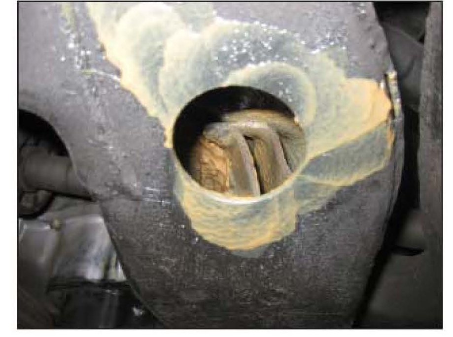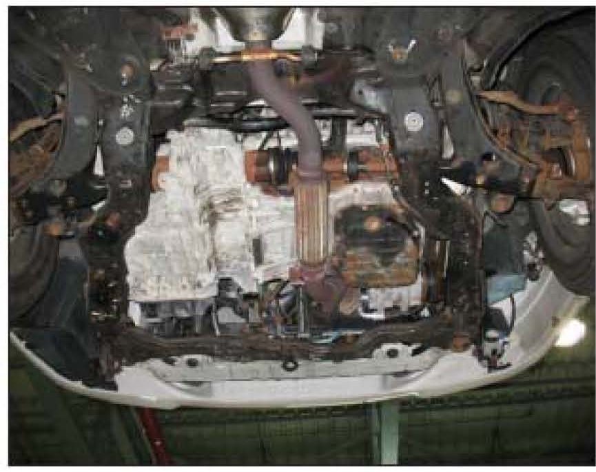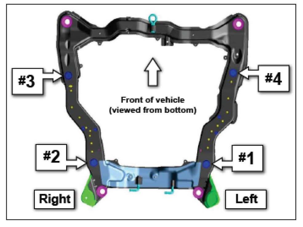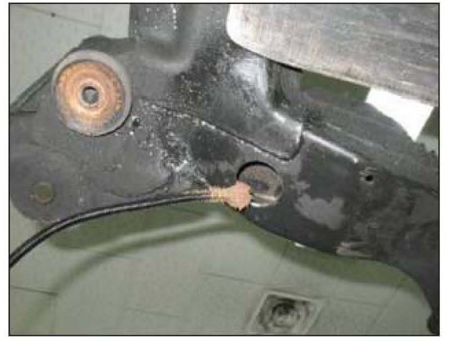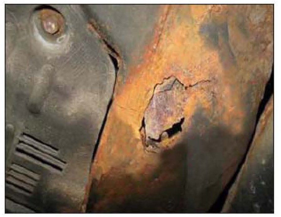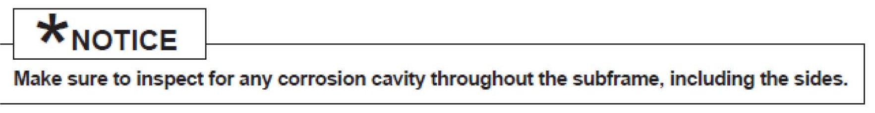 2. Inspect the entire subframe assembly for any external signs of severe corrosion/perforation. a) If any perforation or open cavity is found in the subframe, do not continue repairing. Replace the subframe according to TSB GEN 026. If no signs of perforation or severe corrosion are found continue to step (b).