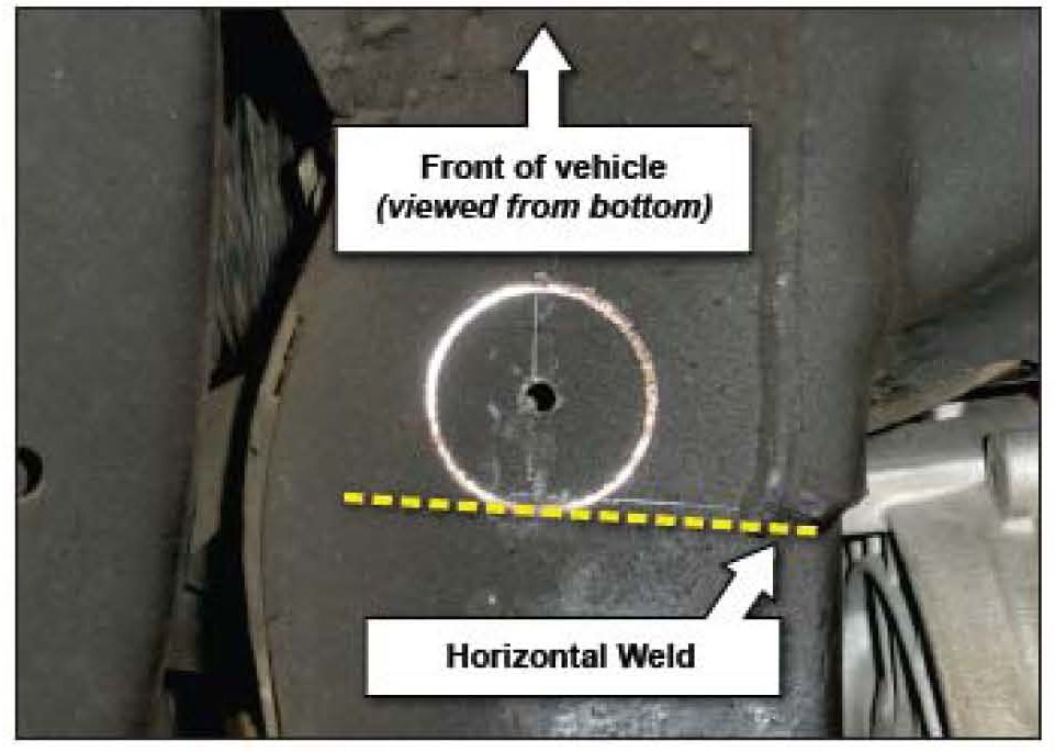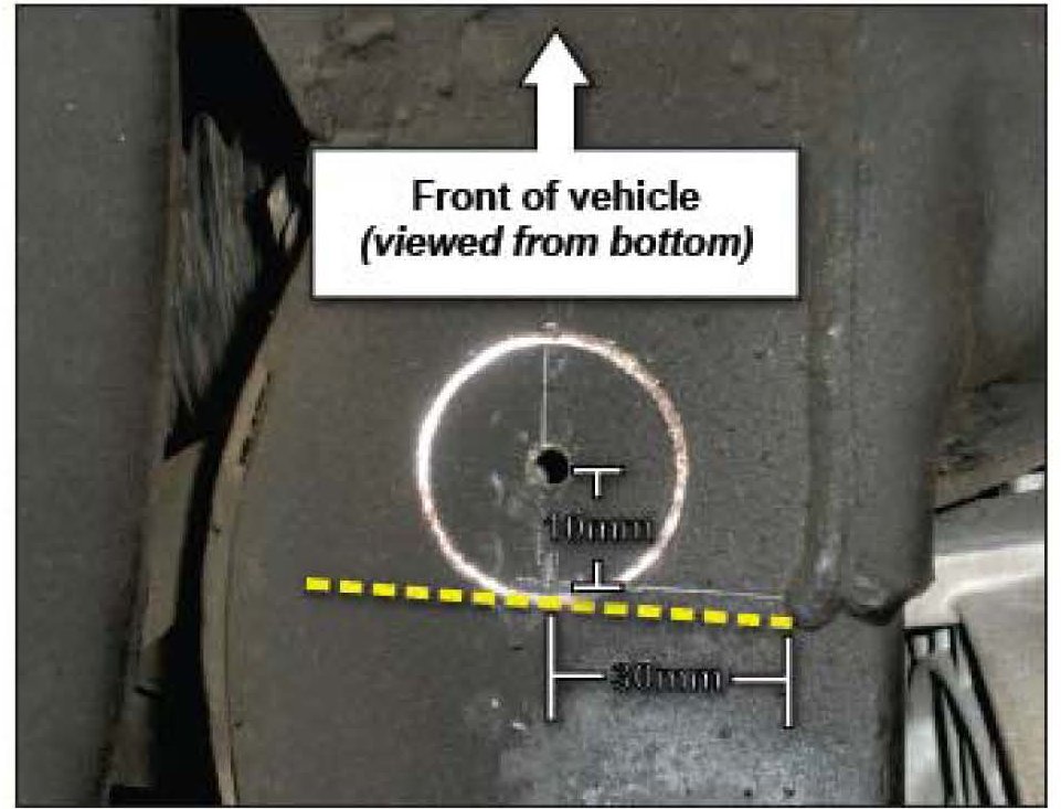 2. Located on the left-rear of the subframe is drilling site location (One) 1. Using a straight edge ruler, scribe or draw a seventy (70) mm line from the end of the horizontal weld (dashed Line).