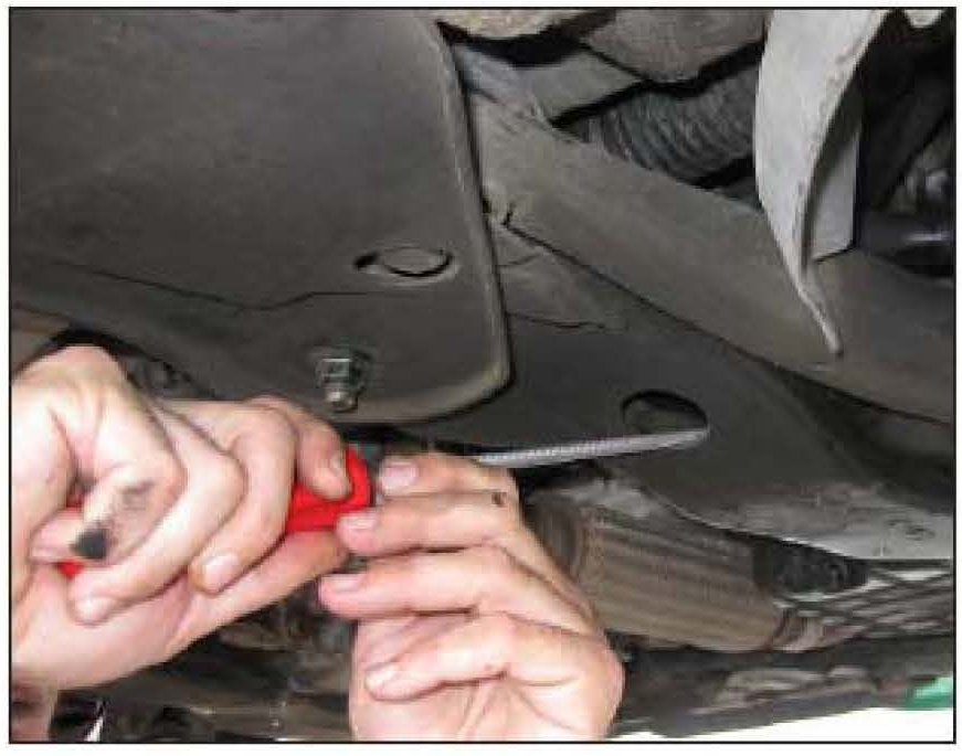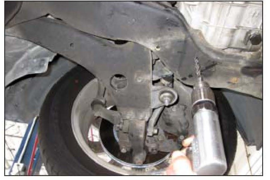 a) Strike the underside of the subframe lightly with a hammer to cause vibration and dislodge any rust scale.