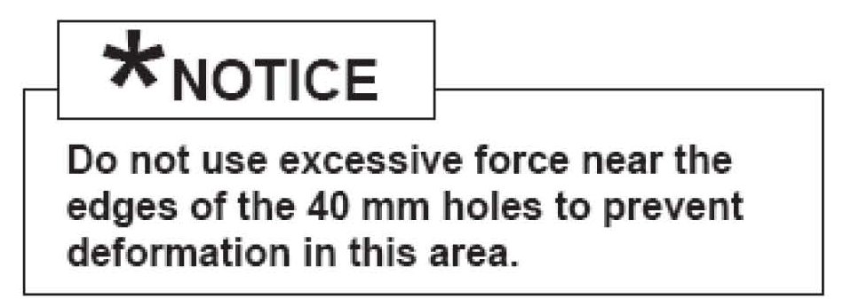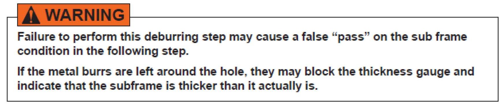 5. Debur the holes on both sides in several areas around the edges of the 40 mm hole so that an accurate judgment of the subframe material thickness can be made.