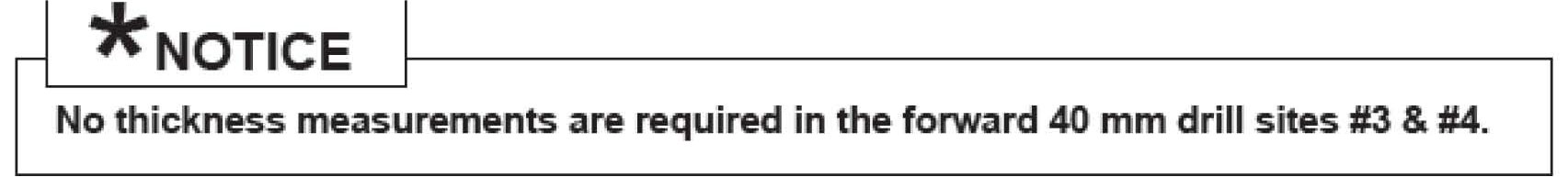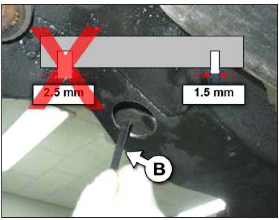 6. Insert the 1.5 mm side (smallest width) of the thickness gauge. Attempt to slide the thickness gauge over the edge of the hole in several different locations on both left/right rear inspection sites.