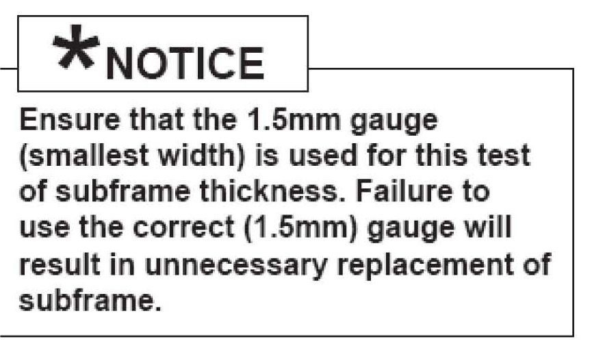 a) If the thickness gauge (B) is able to pass over the subframe material, it has failed the 1.5 mm minimum thickness test. Replace the subframe according to TSB GEN 026.