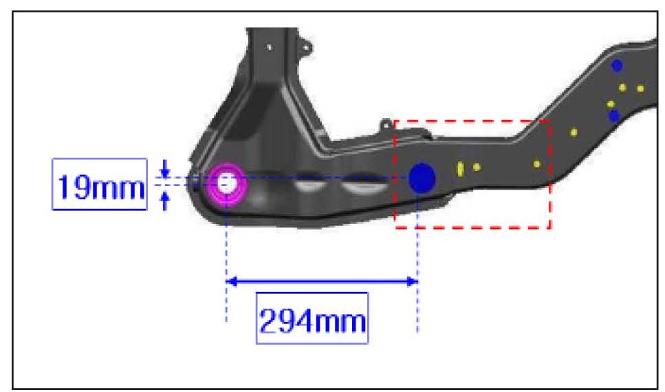 7a. In preparation for drilling the 40 mm hole-saw site three (3) in the right front, the following method must be used to insure proper drilling location. Locate the center point of the right side subframe bushing bolt, use a straight edge to draw a horizontal line for 19 mm inboard. From the end of the 19 mm horizontal line, use a straight edge to draw a vertical line for 294 mm. From the end of the 294 mm vertical line, mark this location as the center point for drilling. Drill this location using the 40 mm hole-saw. (Drill Speed Recommendation: 380 ~ 470 rpm).