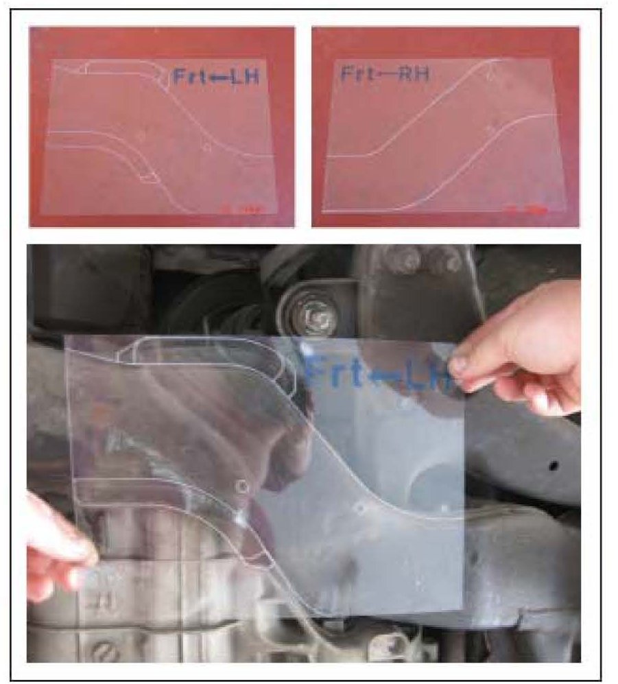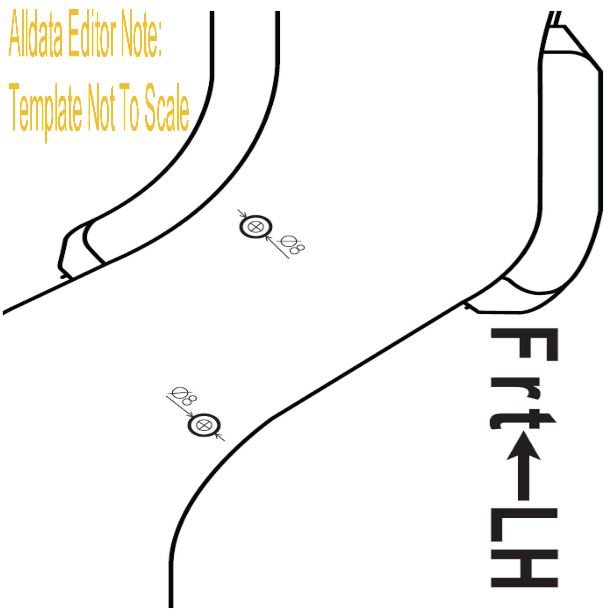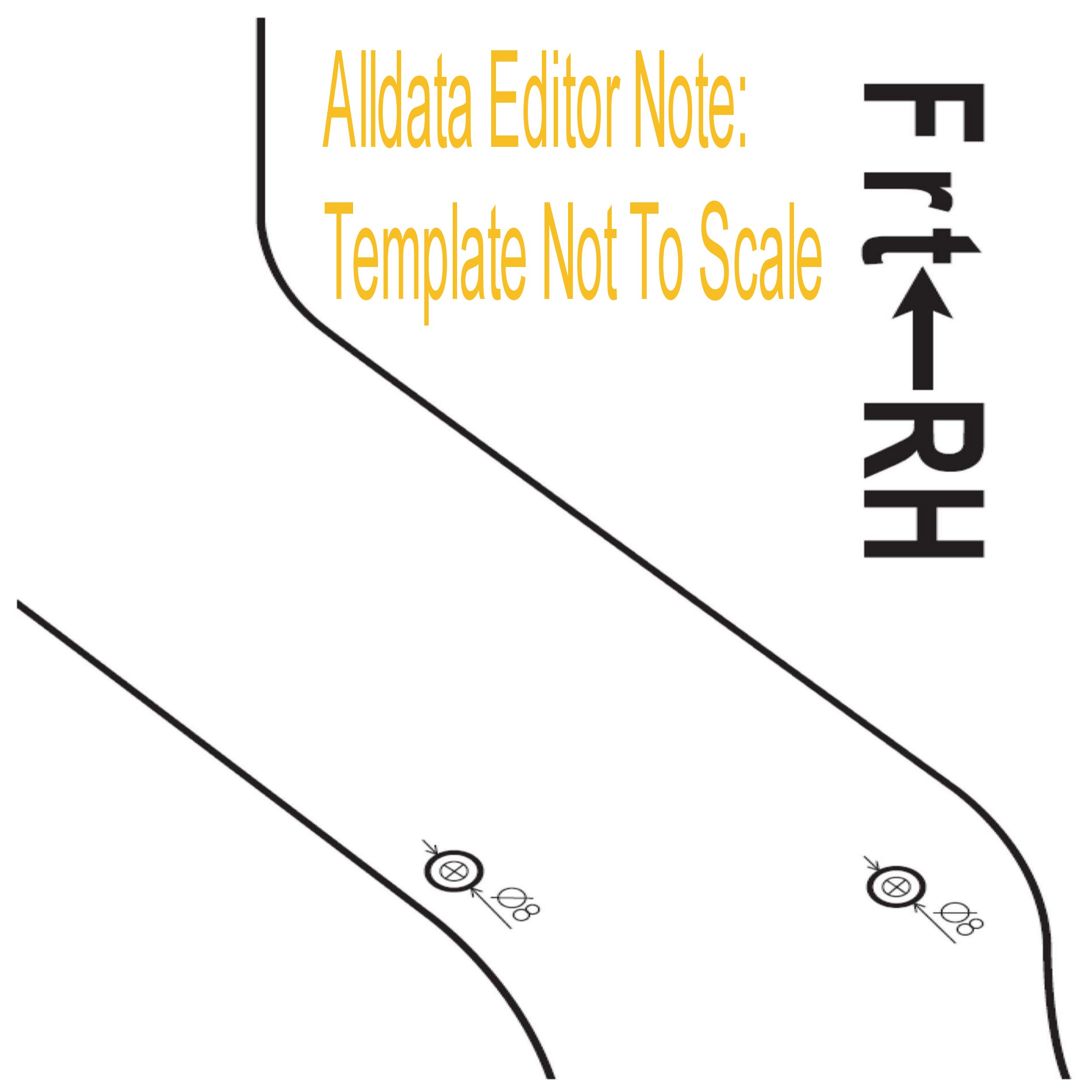8. Place the LH and RH templates against the underside of the subframe, just parallel to the control arm with the arrows pointing forward. Align the outlines on the templates to the outboard shape of the subframe. Ensure proper orientation of the front (Frt) alignment of the templates for left/right. Use a grease pen to mark through the two holes on each template.