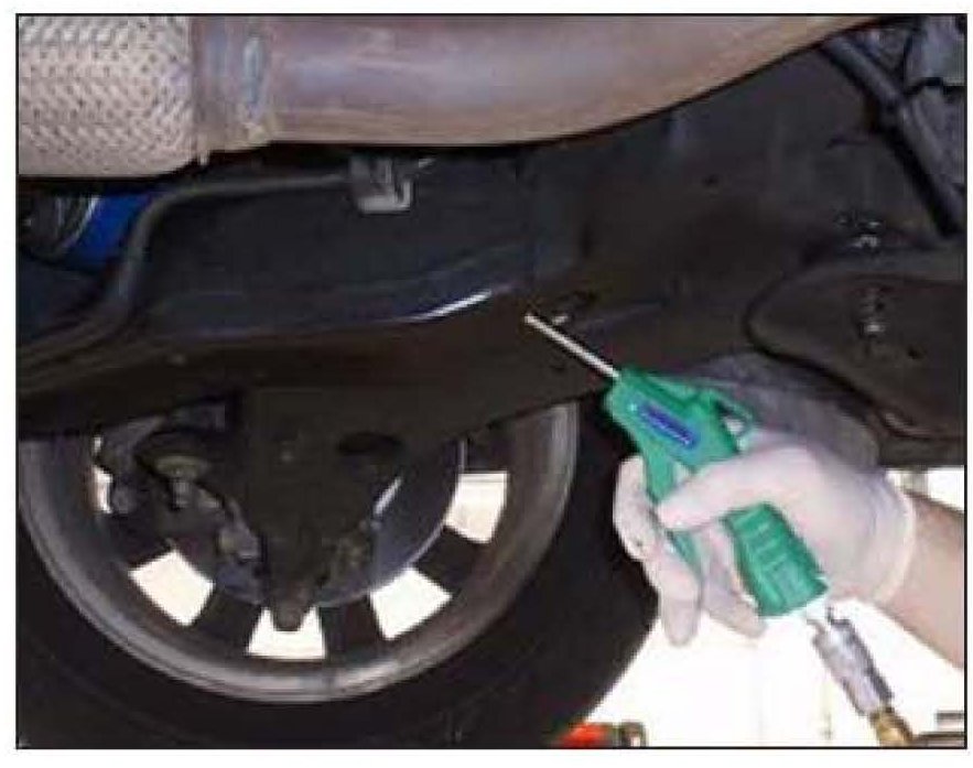 c) Insert either of the two air blow guns into each of the four 40mm holes and use shop air to blow as much of the rust particles as possible from inside the sub frame. In some cases, if there is a large amount of loose rust scale present you may have to repeat the above steps another 2 to 3 times.