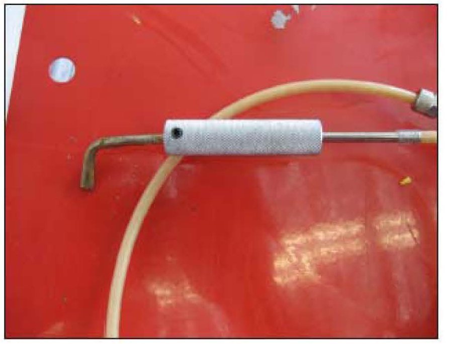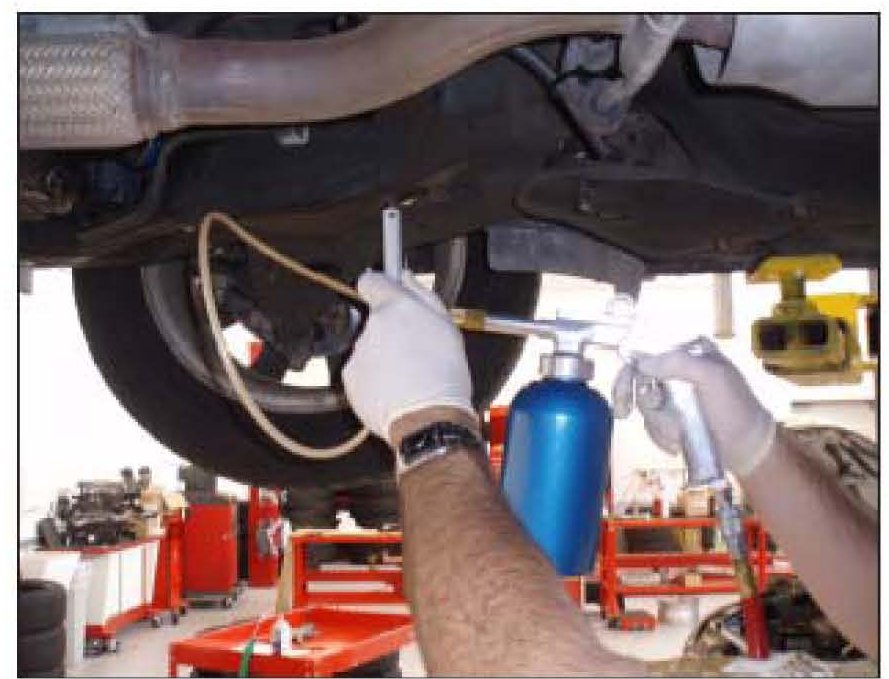 11. Pour one bottle of VG-101 Rust Preventive (Cavity Wax) into the wax injection container and connect the 90 degree nozzle assembly (shown). Spray the cavity wax into each of the four 40mm holes and in all directions until using the entire bottle of cavity wax. You should begin to see some of the cavity wax draining from the four drain holes and other open areas of the subframe.