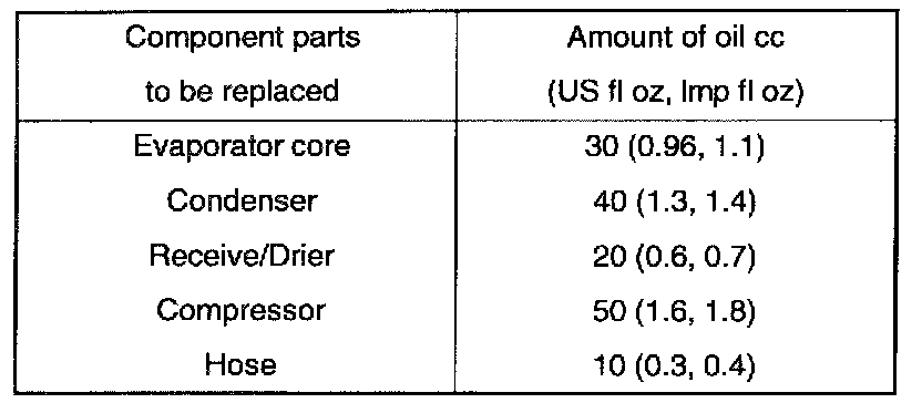 When replacing the systems component parts, be sure to add the above amount of oil to the parts being replaced.