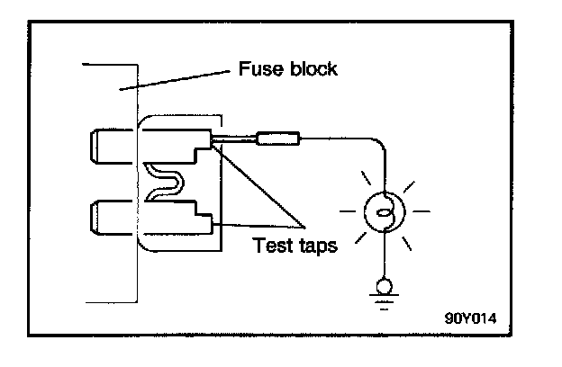 A blade type fuse has test taps provided to allow checking of the fuse itself without removing it from the fuse block. The fuse is okay if the test lamp comes on when its one lead is connected to the test taps (one at a time) and the other lead is grounded. (Change the ignition switch position adequately so that the fuse circuit becomes live.)