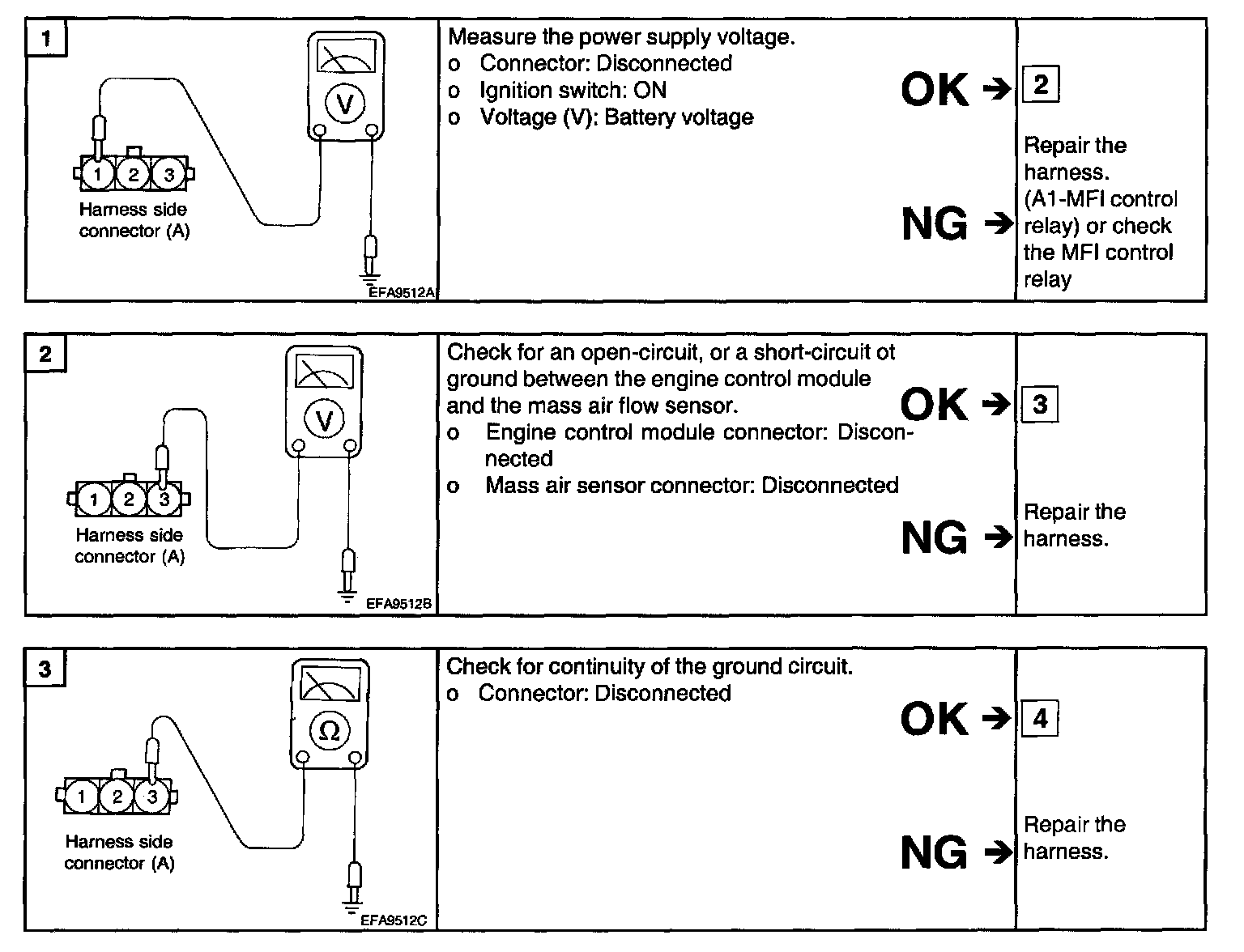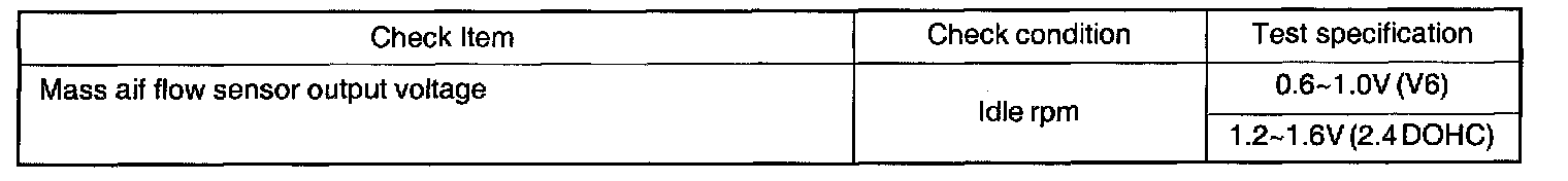 2. If the MAF sensor output voltage is other than 0 when the ignition switch is turned on (do not start the engine). Check for the faulty MAF sensor or ECM.