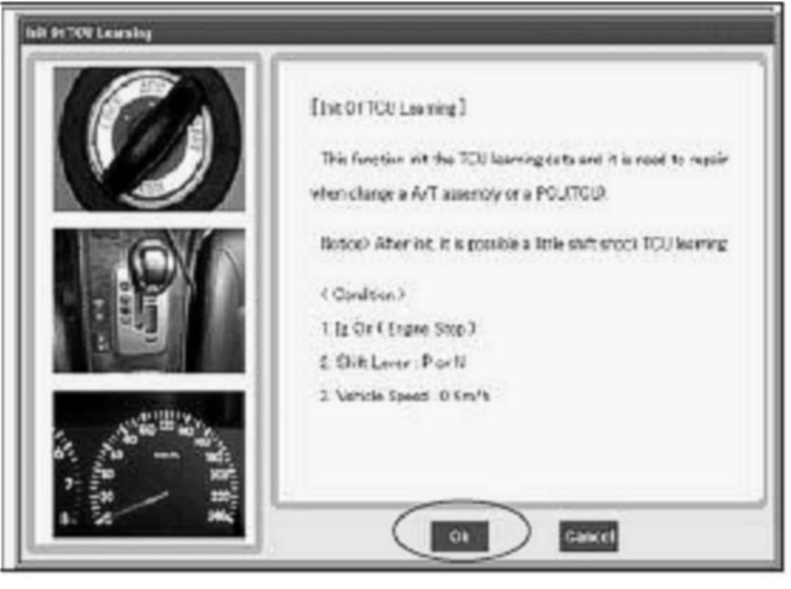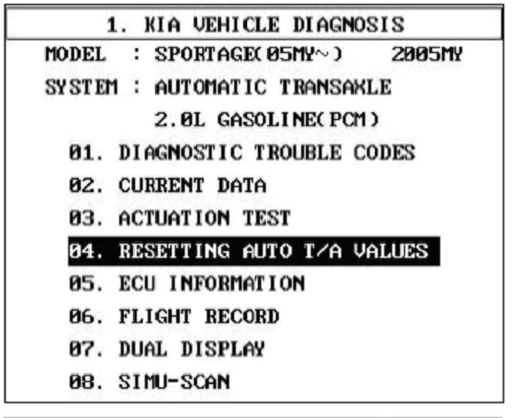 Use the GDS or Hi-Scan Procedure to reset the automatic transmission adaptive values found in the automatic transmission section menu. Follow the steps shown in RESETTING AUTO T/A VALUES or INIT OF TCU LEARNING (Sorento - TCU SUB ROM RESET) menu sections