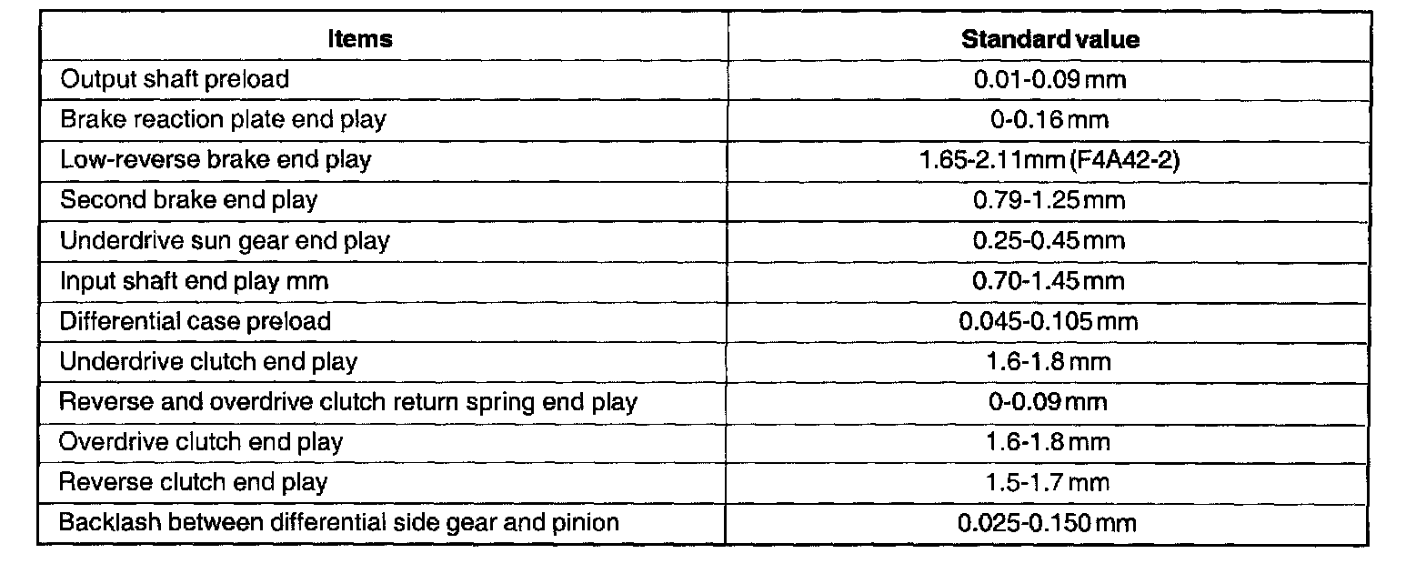 Low-reverse brake end play 1.65-2.11 mm (F4A42-2)