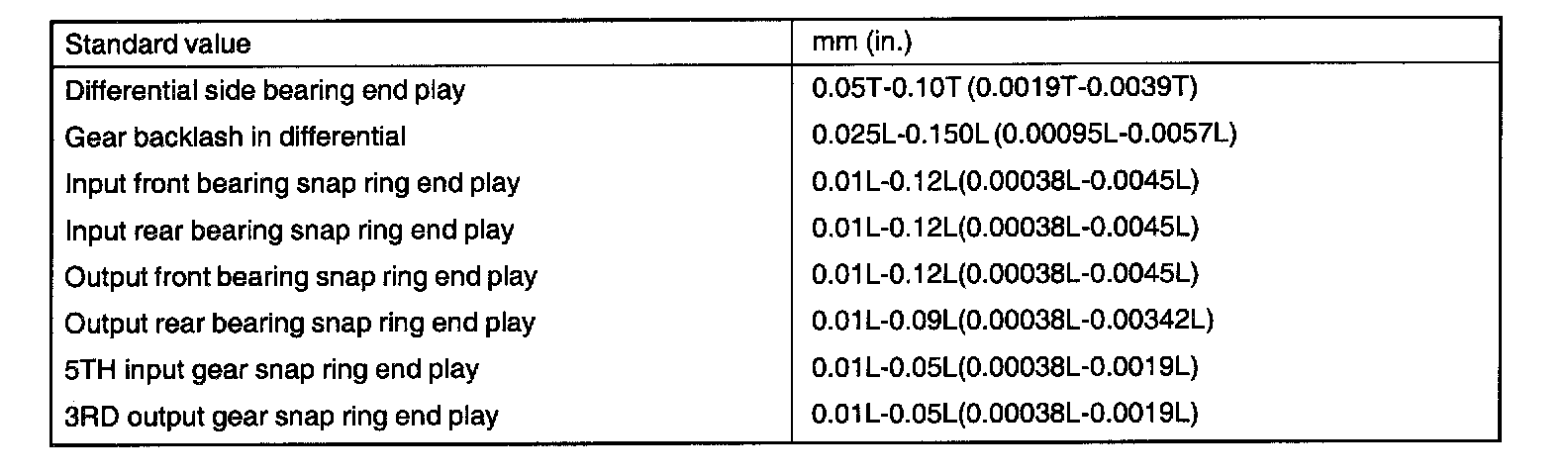 5TH input gear snap ring end play 0.01L-0.05L mm (0.00038L-0.0019L in)