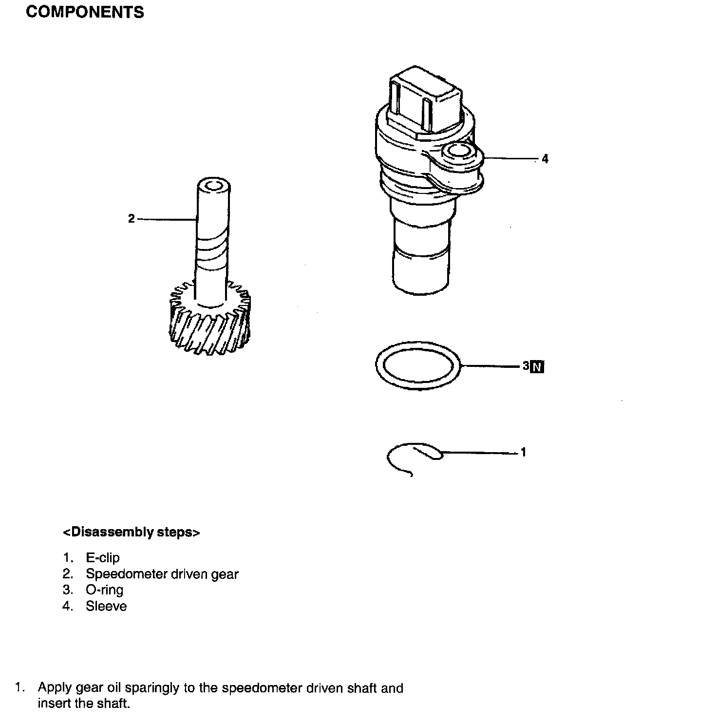 Apply gear oil sparingly to the speedometer driven shaft and insert the shaft.