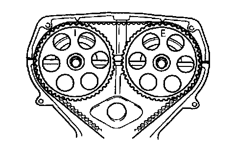 Check that "I" mark on intake camshaft pulley is aligned with mark on cylinder head cover and "E" mark on exhaust camshaft pulley is aligned with mark on cylinder head cover.