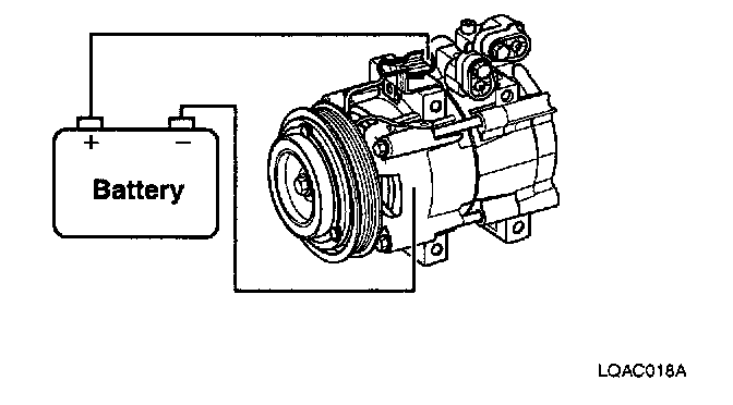 Connect the compressor terminal to battery(+) and the battery(-) terminal to the compressor body. Verify magnetic clutch operation by a clicking noise.
