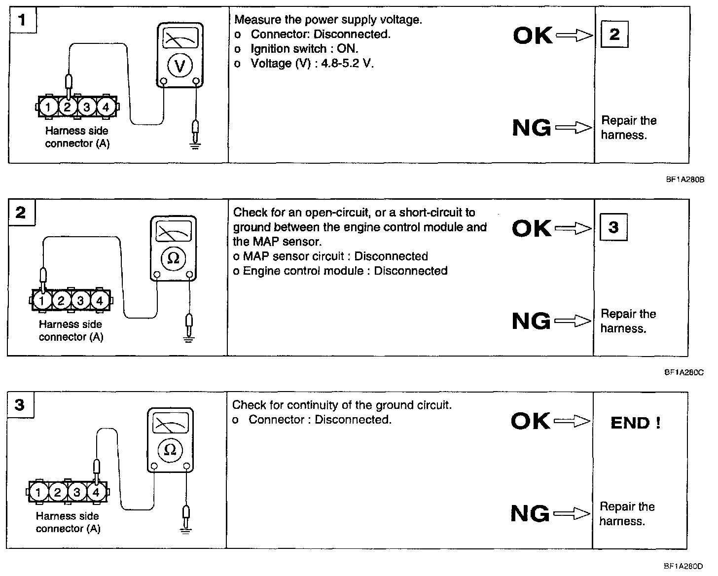 1. Connect the voltmeter between 1 and 4 of MAP sensor connector.