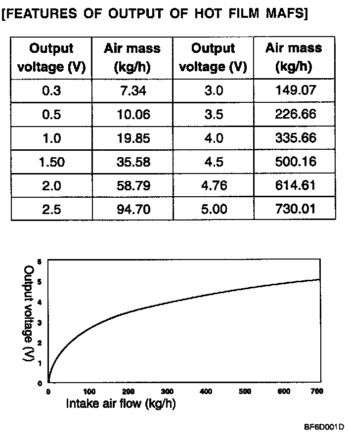 2. If the MAFS sensor output voltage is other than 0 when the ignition switch is turned ON (do not start the engine), check for faulty MAFS and ECM.