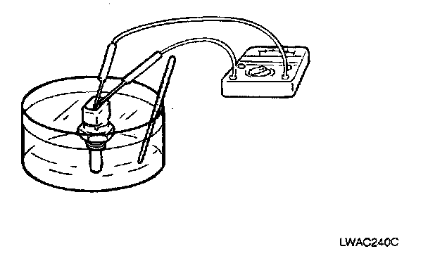2. With the temperature sensing portion of the water temperature sensor immersed in hot water, check the resistance.