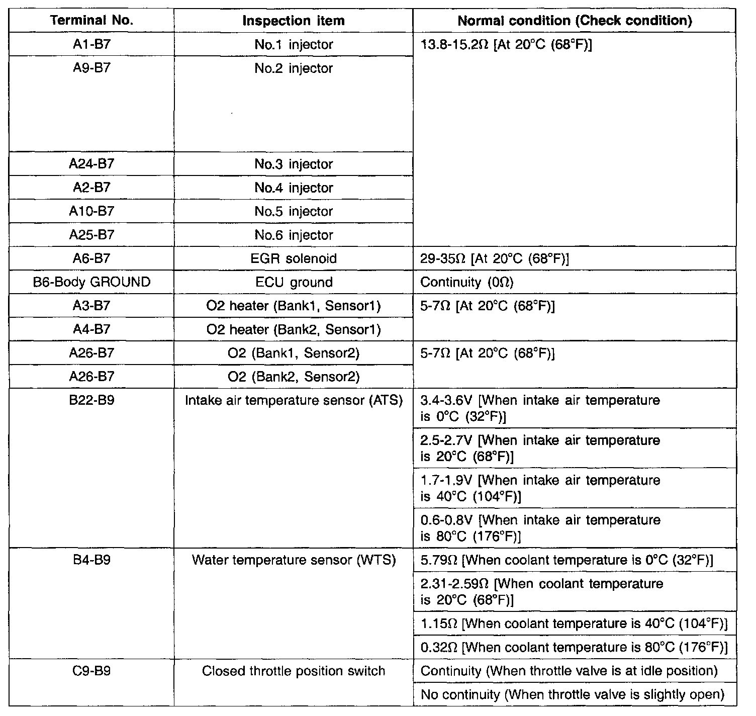 3. If the ohmmeter shows any deviation from the normal condition, check the corresponding sensor, actuator and related electrical wiring, and then repair or replace.