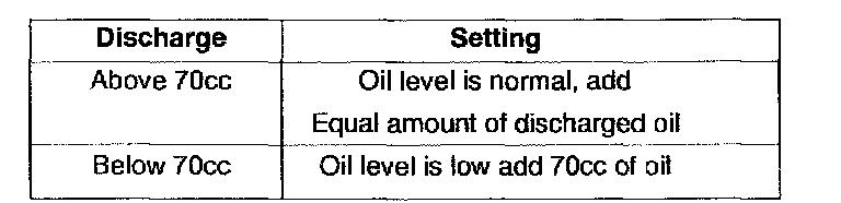 3. Check the amount of the discharged oil. If it is less than 70 cc, it means there is a little leak of oil. Perform the leakage test on each system connection, and repair or replace faulty parts if necessary.