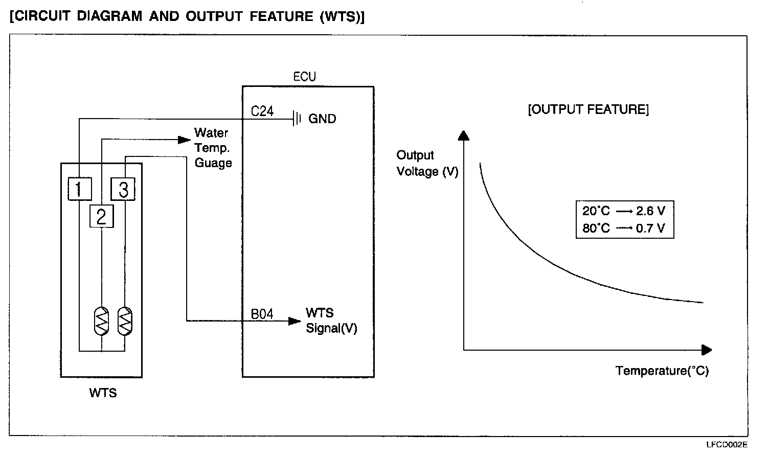 WATER TEMPERATURE SENSOR (WTS)Water Temperature Sensor (WTS) installed in the engine coolant passage of the cylinder head detects the engine coolant temperature and emits signals to the ECU. This part employs a thermistor which is sensitive to changes in temperature. The electric resistance of the thermistor decreases in response to a temperature rise (NTC). The ECU determines engine coolant temperature by the sensor output voltage and provides optimum fuel enrichment when the engine is cold.