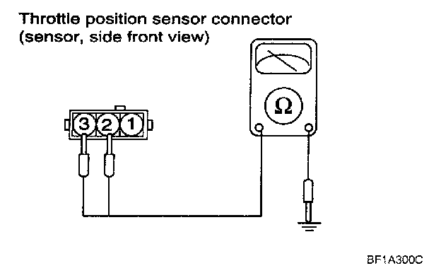3. Connect a pointer type ohmmeter between terminal 3 (sensor ground) and terminal 1 (sensor output) for 2.4 DOHC and between terminal 2 (sensor ground) and terminal 1 (sensor output) for 2.7 V6.