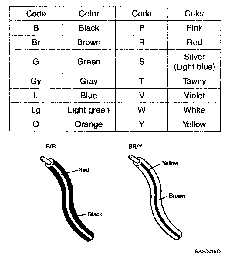 Two-color wires are indicated by a two-color code symbol. The first color indicates the base color of the wire, the second color indicates the color of the stripe