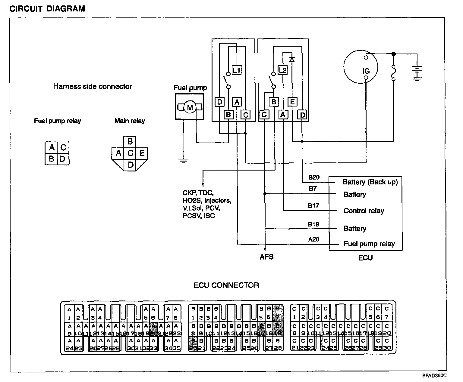 CONTROL RELAYWhen the ignition switch is turned on, battery voltage is applied from the ignition switch to the ECU, turning ON the ignition power transistor and energizing the MFI control relay coil. This turns ON the MFI control relay switch, and supplies power from the battery to the ECU through the MFI control relay switch.