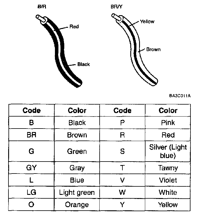 Two-color wires are indicated by a two-color code symbol. The first color indicates the base color of the wire; the second color indicates the color of the stripe.