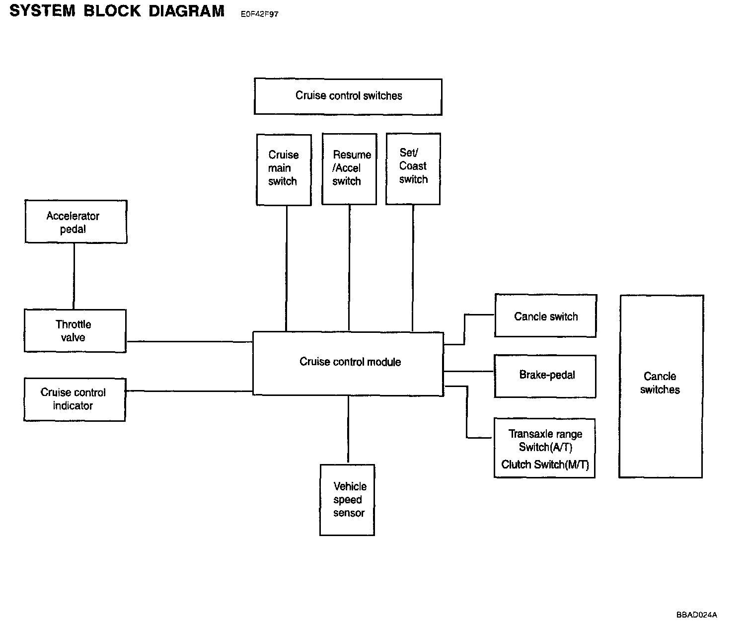 Transaxle range switch and brake switch are provided to disengage the cruise control system. The switches are on brake pedal bracket and transaxle. When the brake pedal depressed or select lever shifted, the cruise control system is electrically disengaged and the throttle is returned to the idle position.