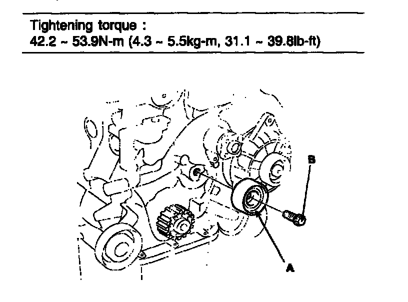 12. Remove the crankshaft pulley bolt(B) and crankshaft pulley(A).