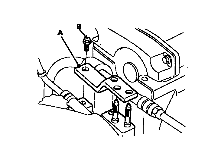 1) Install the engine mounting support bracket stay plate(A) with bolt (B).