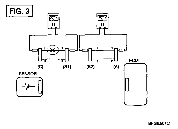 b. Disconnect connector (B), and measure for resistance between connector (C) and (B1) and between (B2) and (A) as shown in [FIG.3].