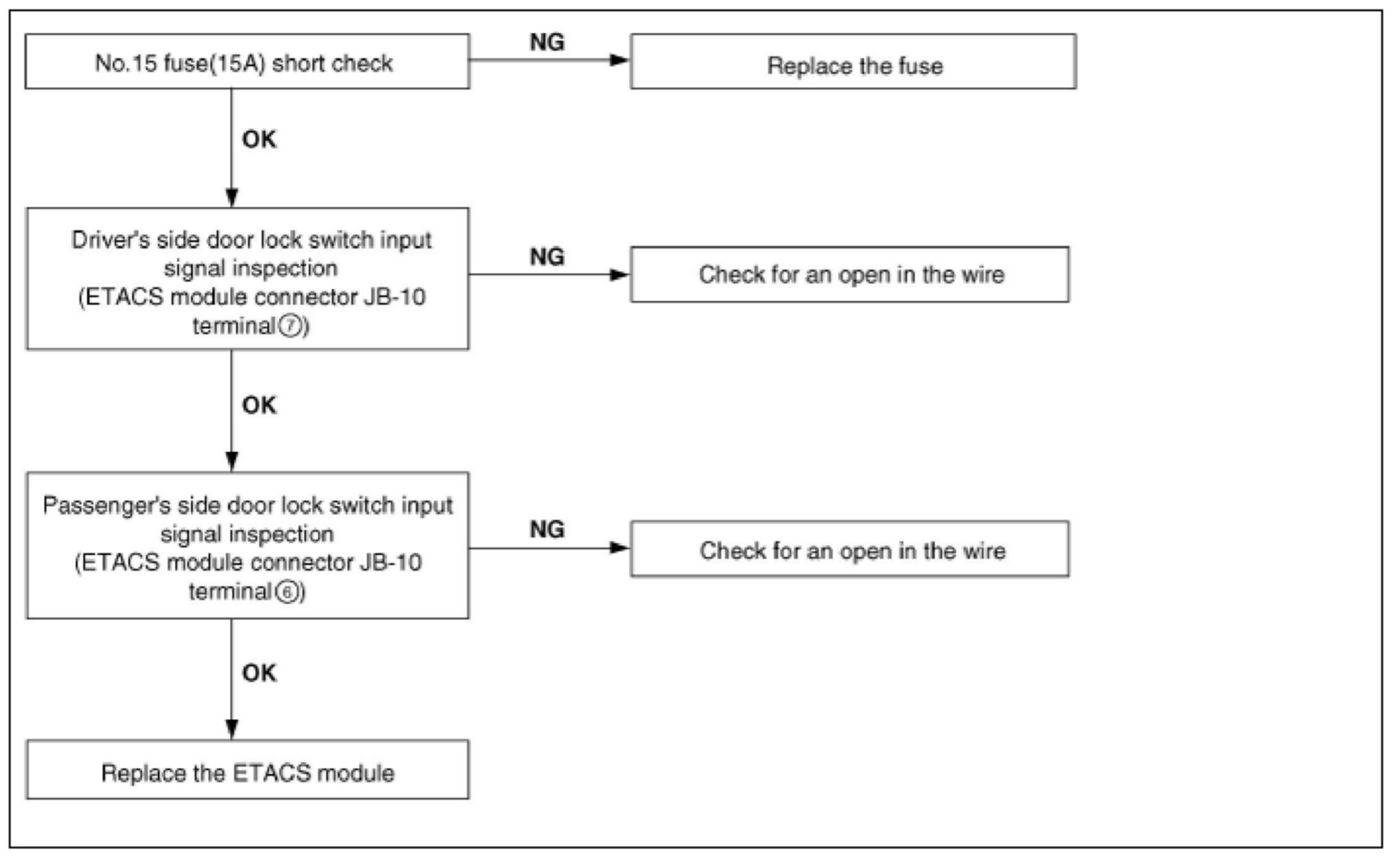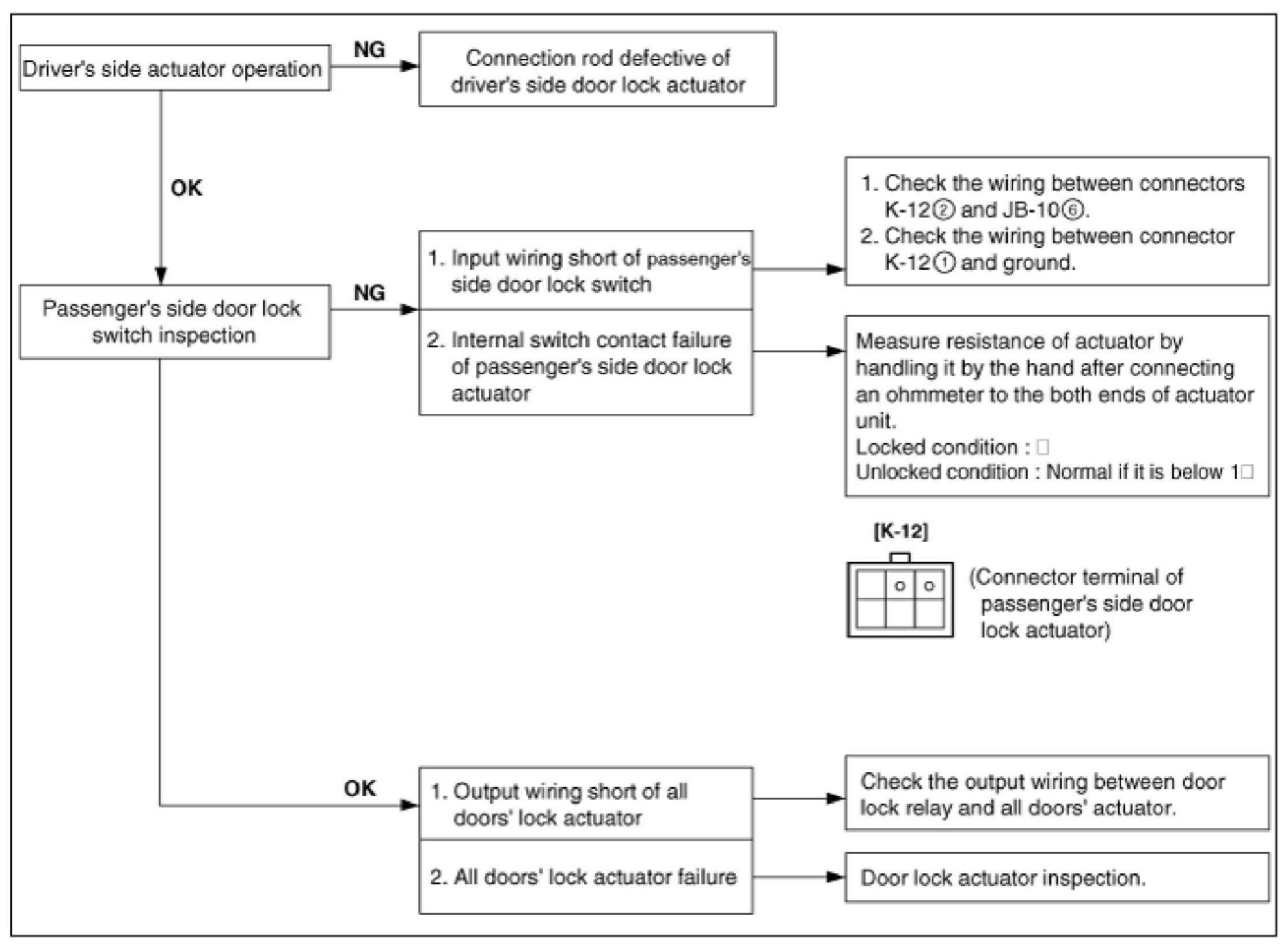 2. Unlock function works but lock function does not work. -> Since door lock relay is fail, replace the door lock relay.
