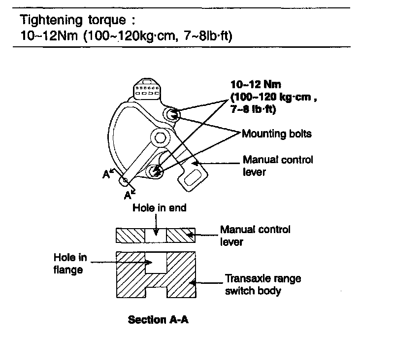 4. Loosen the transaxle range switch body mounting bolts and then turn the transaxle range switch body so the hole in the end of the manual control lever and the hole (cross section A - A in the figure) in the flange of the transaxle range switch body flange are aligned.